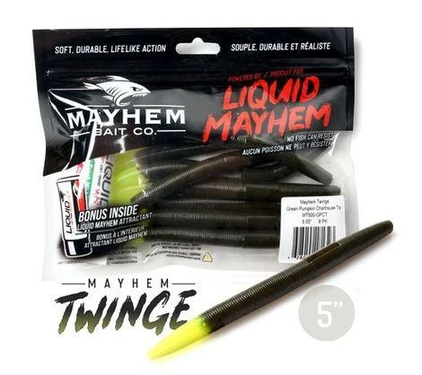 Our 5.0″ Mayhem Twinge is a fantastic bait for Texas Rigging, Drop Shotting, Whacky Worm, or Weightless Rigging just to name a few. When paired with a quality bait scent like Liquid Mayhem, this bait is guaranteed to land more fish!