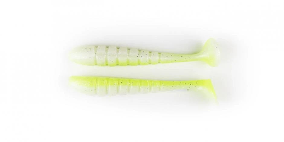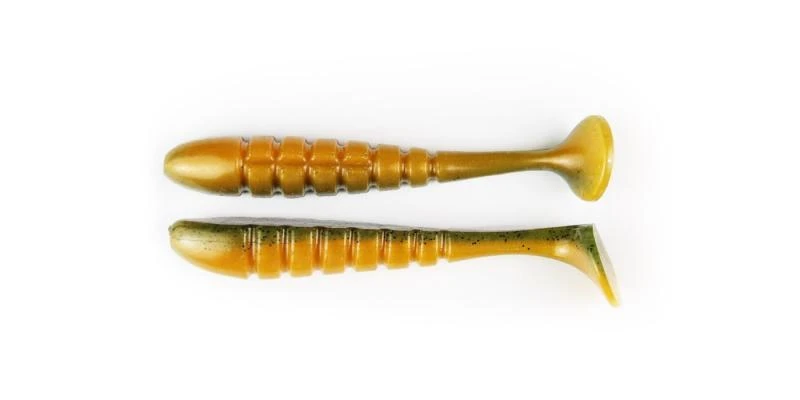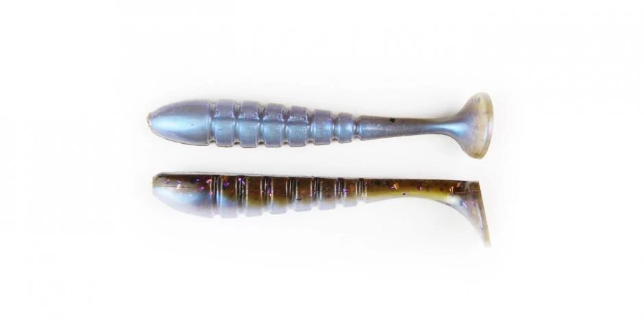 It has a specialized design with unique ribbed sides and a special three-dimensional paddle tail, providing a lifelike movement and vibration making the bait rock back and forth as it swims. Rig on a Swimbait head, Jig Head or belly weighted EWG Hook and slow roll deep structure or burn over shallow grass and over flats.